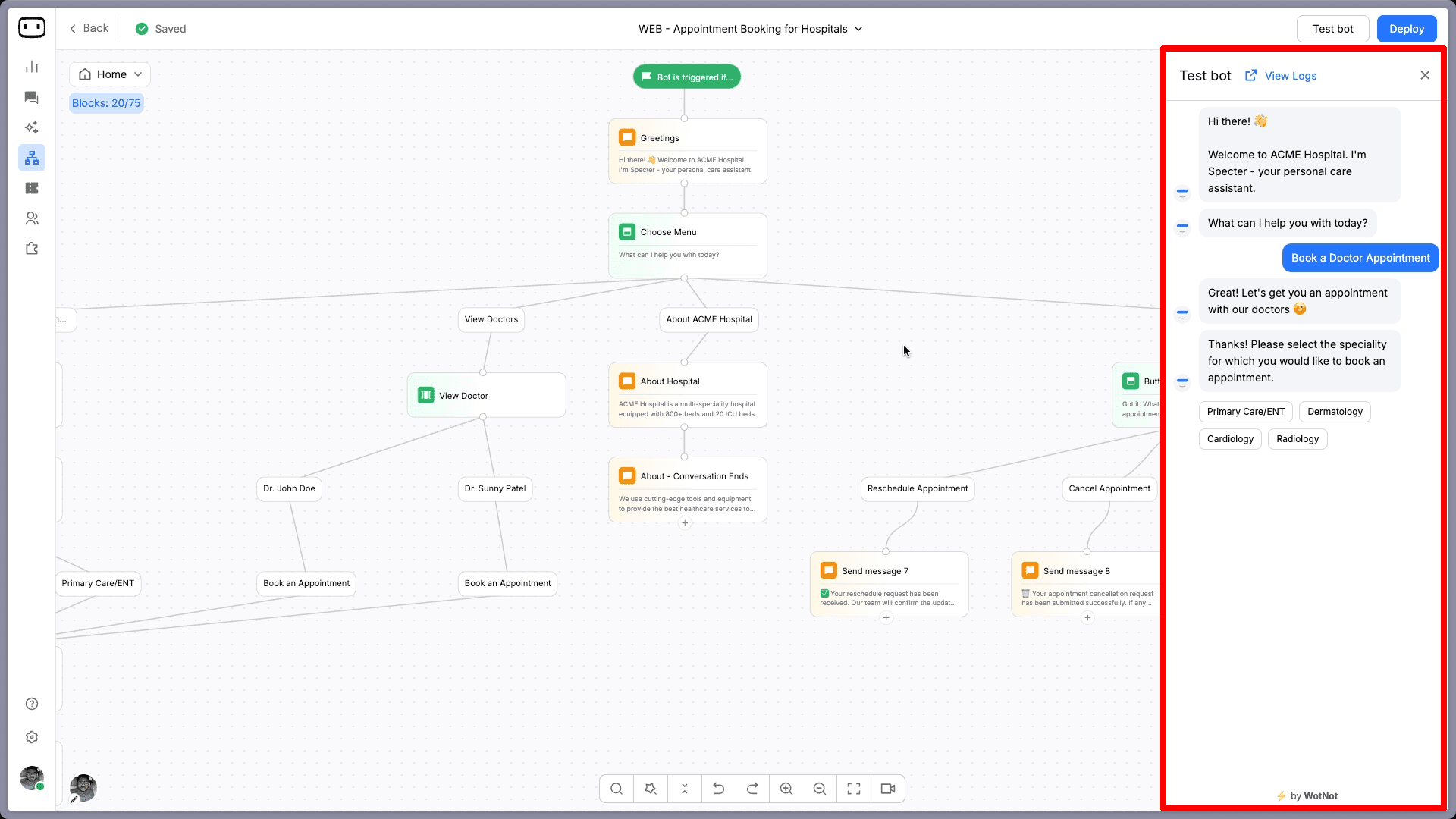 WotNot has a built-in testing panel. Click "Test bot" in the top right corner of the builder, and a live preview opens alongside your flow. You can walk through the entire conversation as if you were a visitor on your website.