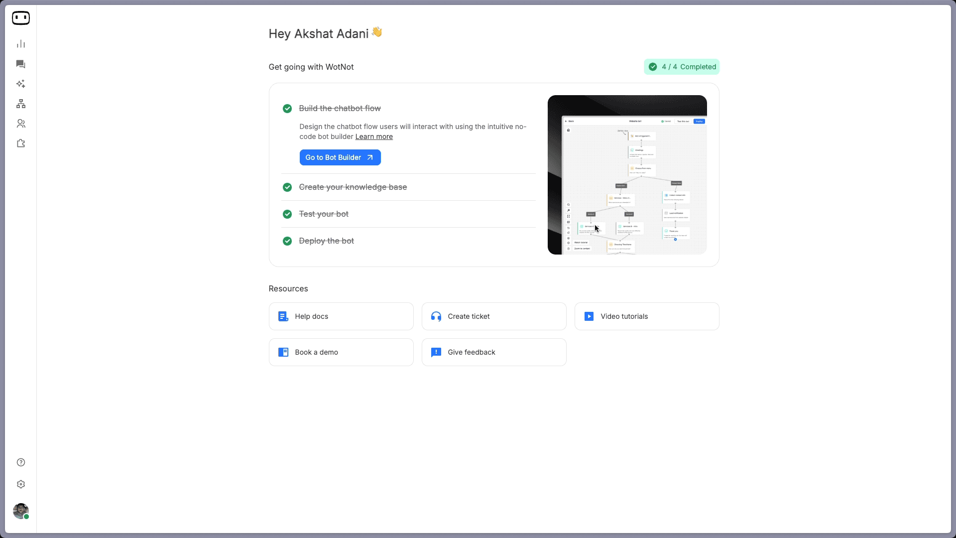 Once you sign up, you land on the welcome dashboard. WotNot lays out the process in four steps right on the screen: Build the chatbot flow, Create your knowledge base, Test your bot, and Deploy the bot.