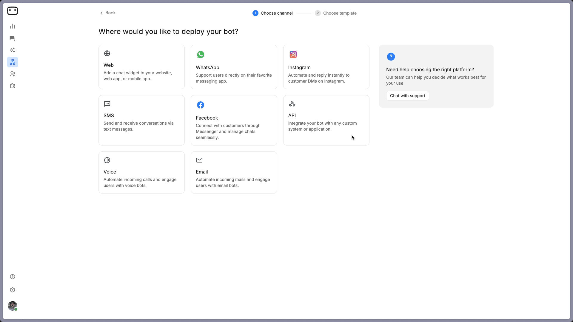 The first thing the platform asks is where you want the chatbot to live.