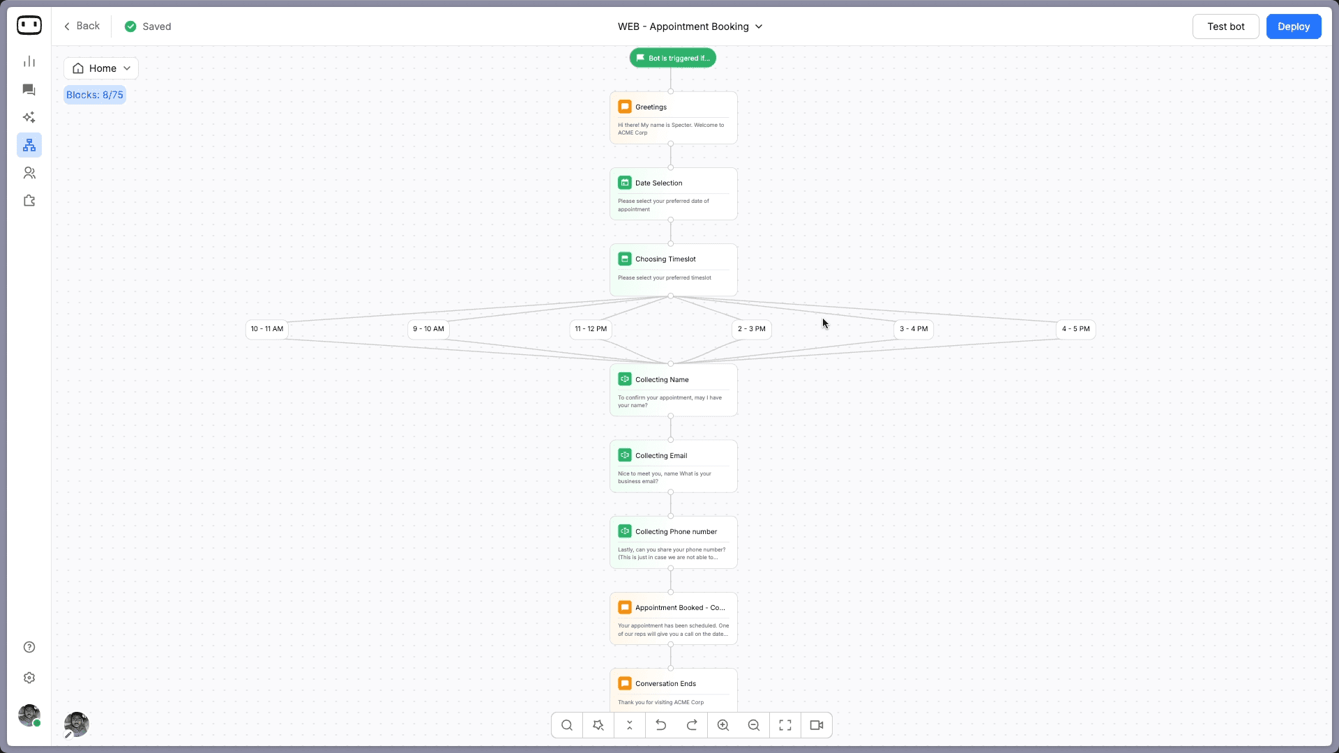 Every block in this flow is editable. Click any block, modify the content in the side panel, and the flow updates in real time. You can change the greeting to match your brand, adjust available timeslots, add or remove data collection fields, and rewrite the confirmation message. The entire structure is drag-and-drop, so rearranging or adding new blocks takes seconds.