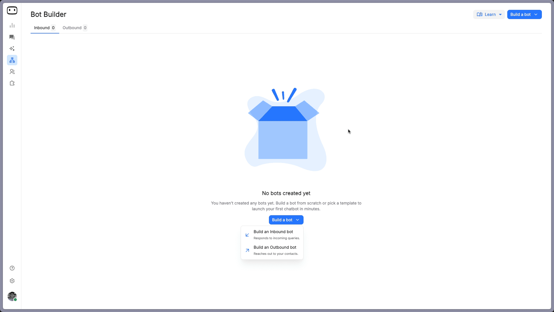 Click "Go to Bot Builder." You will see the Bot Builder page. Click "Build a bot" and select "Build an Inbound bot," which is the type that responds to incoming queries from visitors on your website or messaging channels.