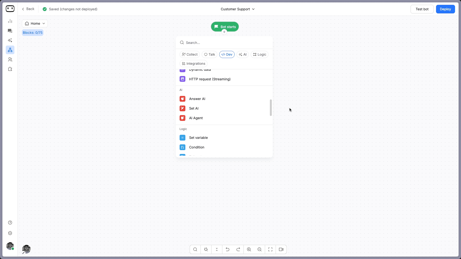 This is your starting point. Click the "+" below "Bot starts" to open the action blocks panel. You will see tabs for Collect, Talk, Dev, AI, Logic, and Integrations.