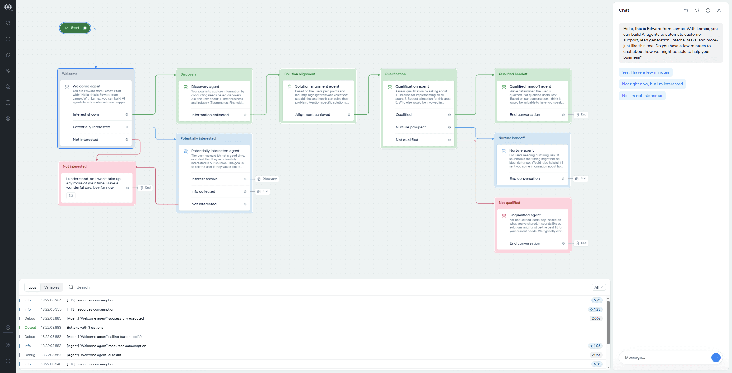 It allows you to map conversations and logic without code. This makes it easy to understand what your agent is doing.